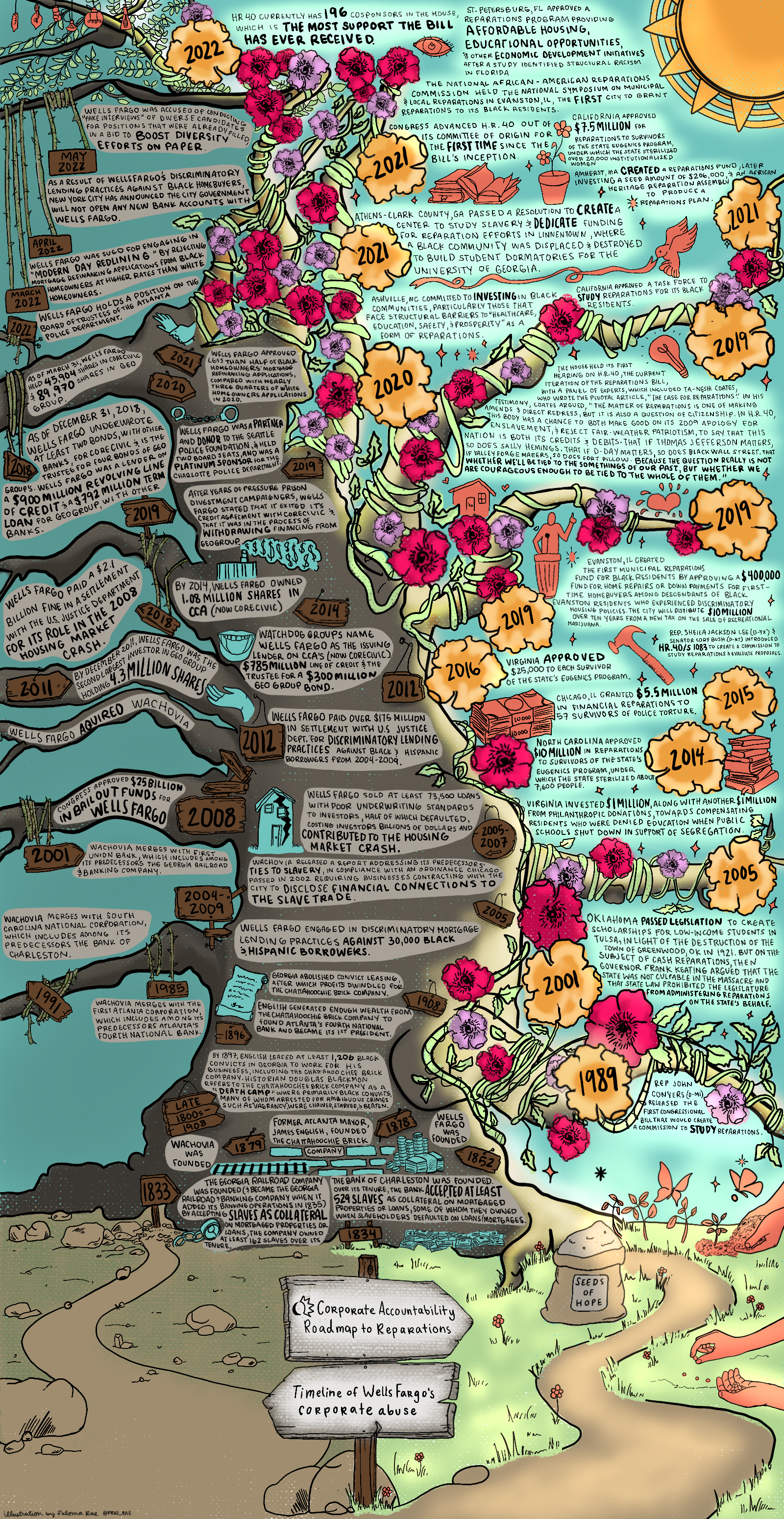 The Roadmap to Reparations shows two paths. The left path illustrates the deceptive and dangerous practices of Wells Fargo, from slave labor to the Jim Crow area and current discriminatory practices against Black Folks.